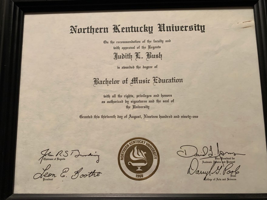 Several years later, I happened to hear Western Kentucky University’s choir singing somewhere.  I’m not sure where we were or why we were there, but as I listened I thought, that’s what I want to do.  I started taking some gen eds at the local community college until I finally had to decide if I was going back to college or not.  Thank goodness that focused band director supported me in my dreams because he started looking for jobs near WKU.  Unfortunately, there were no jobs to be had in that area, so he looked for things around other universities, landing us in Northern Kentucky where I enrolled to finish my degree.  13 years after I began my first degree, I graduated from NKU with a degree in vocal music.